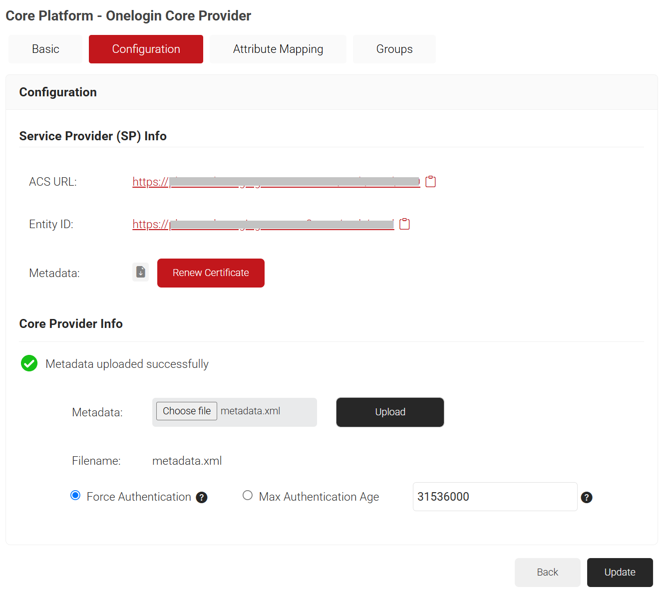 - In the Core Provider Info section, click Choose file and select the OneLogin metadata file that you downloaded in step 4.