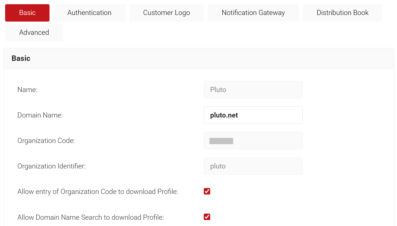 - Navigate to General > Organization and in the Basic section, copy the Domain Name and Organization Identifier to your console.