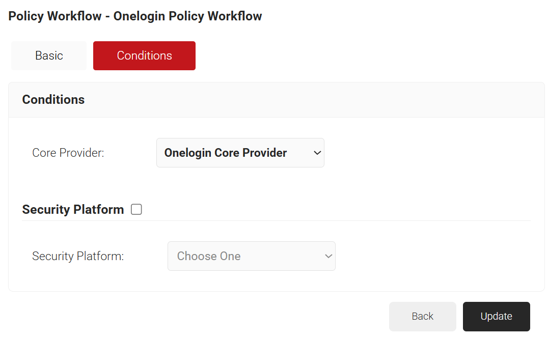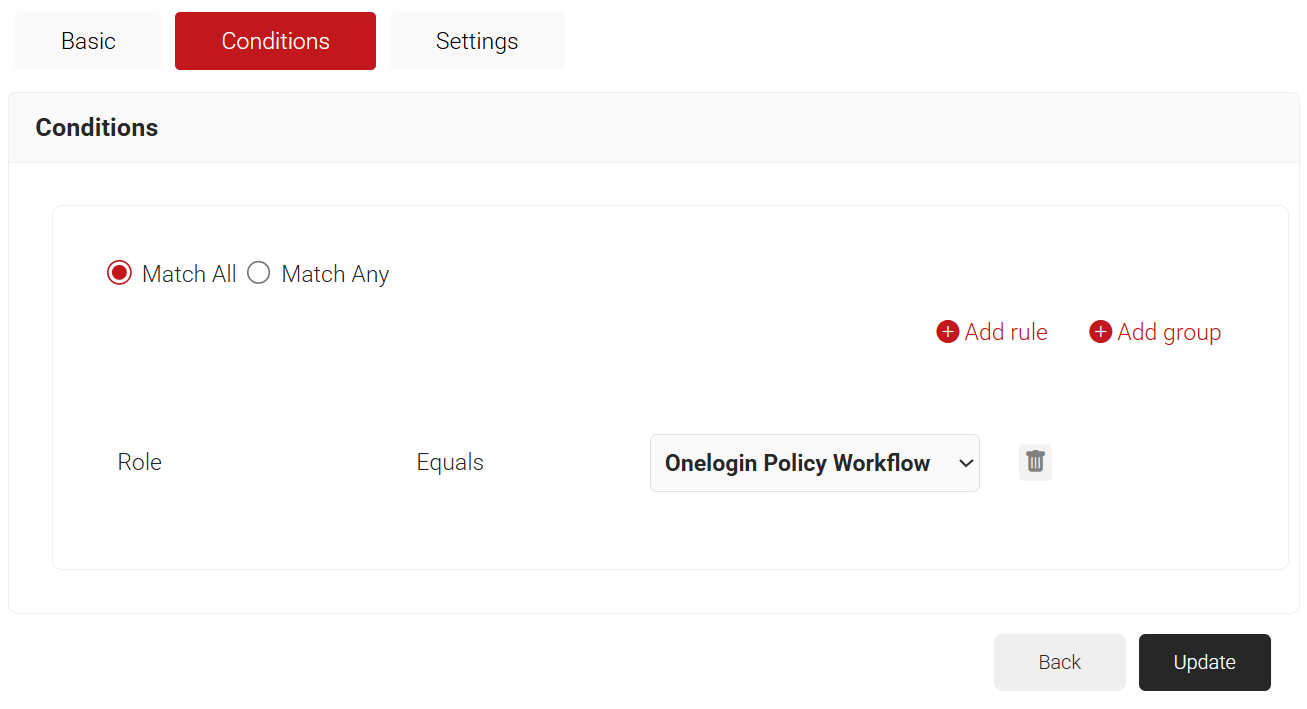 - The Policy Workflow option appears under the Conditions tab.