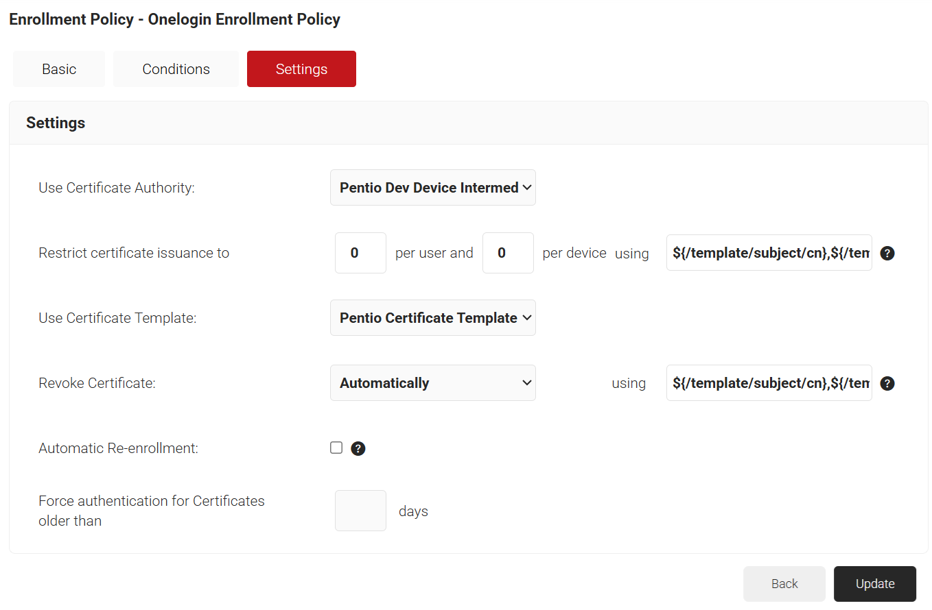 - Click the Settings tab and enter the Use Certificate Authority, Use Certificate Template, and Revoke Certificate attributes, and click Update.