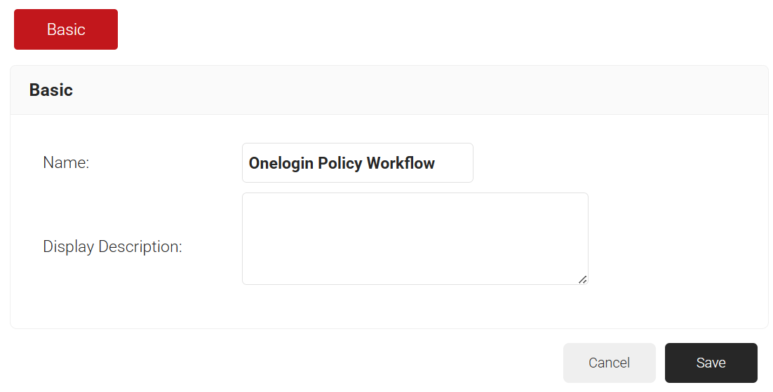 - On the displayed page, enter the name and description of the policy workflow and click Save.