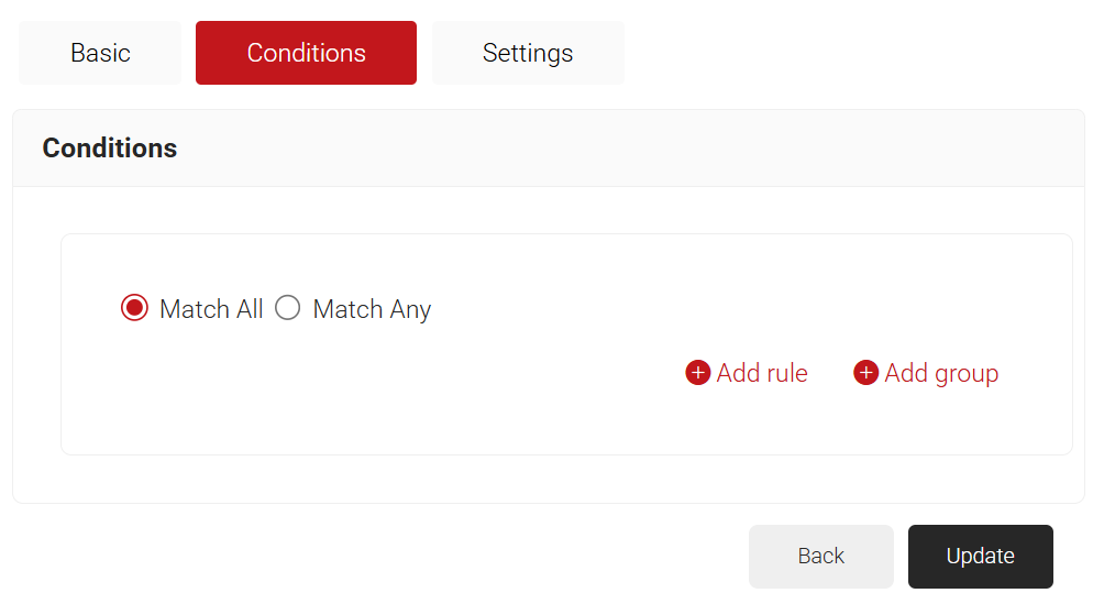 - Click Save. The Conditions and Settings tabs are displayed.