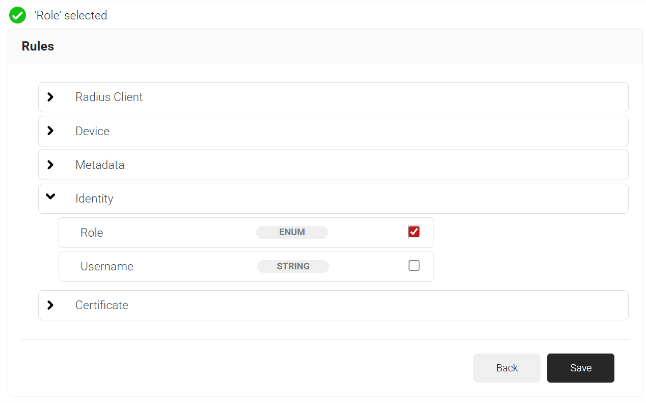 The Network policy defines user access levels (acceptance conditions). The conditions include the Role attribute obtained from the RADIUS client, the Device Role attribute, and information obtained from the device during certificate registration.
