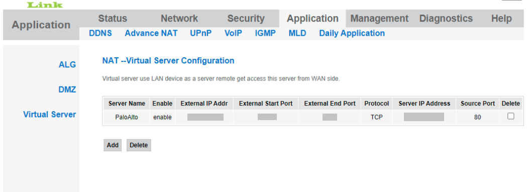 - Create a NAT – Virtual Server Configuration in the ISP router as follows: