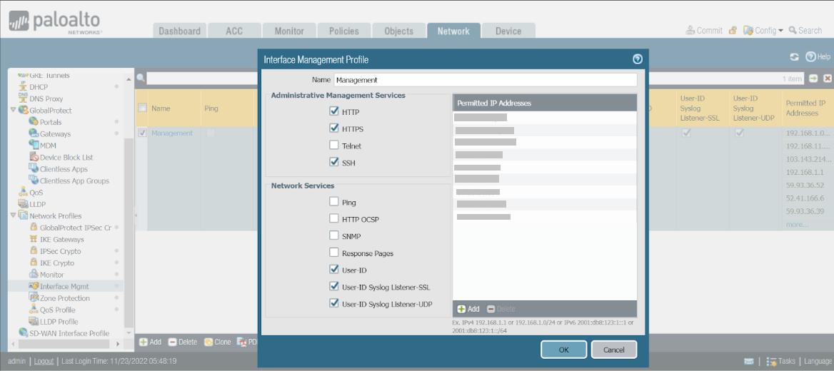 - Navigate to Network > Network Profiles > Interface Management > Management.