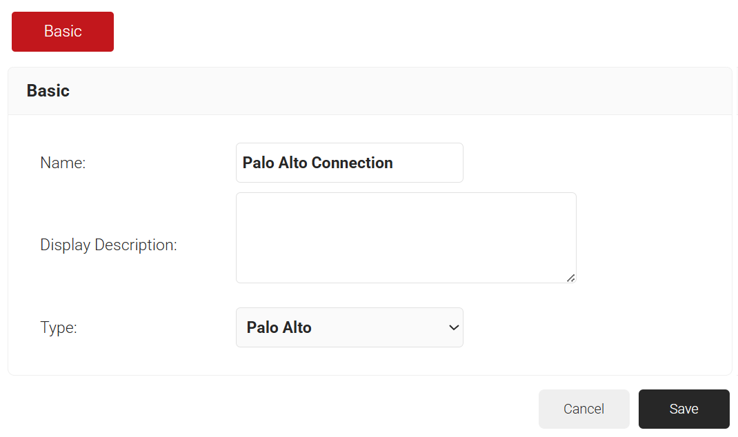 - From the Type drop-down list, select Palo Alto.