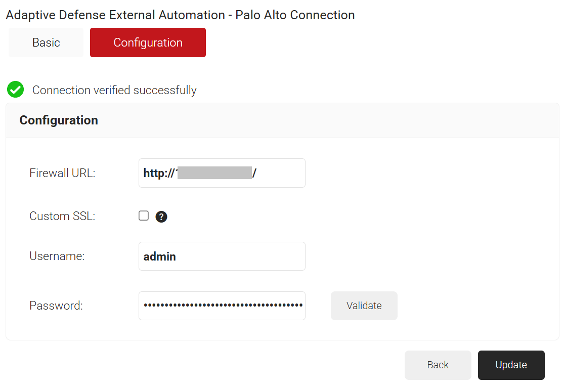 - Click the Validate button to confirm the connection to the Firewall.