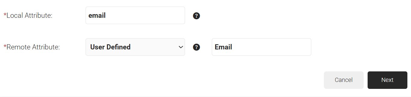 - From the Remote Attribute drop-down list, select User Defined. In the field that appears, enter ‘Email’ and then click Next.