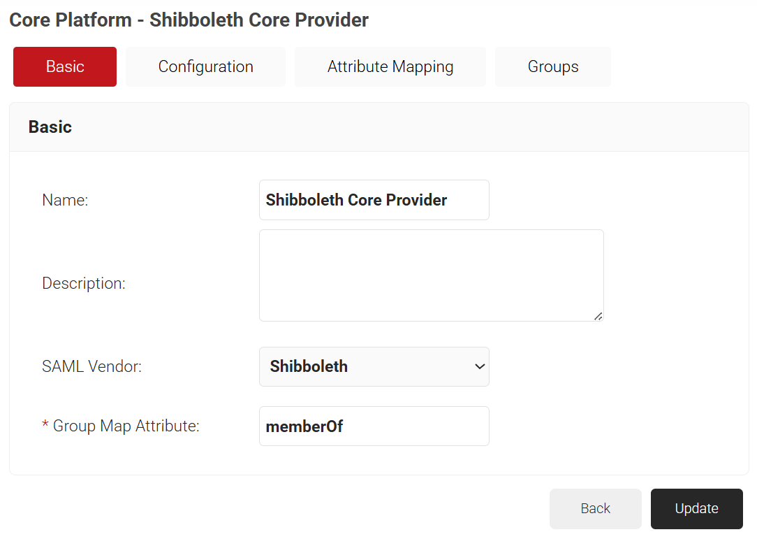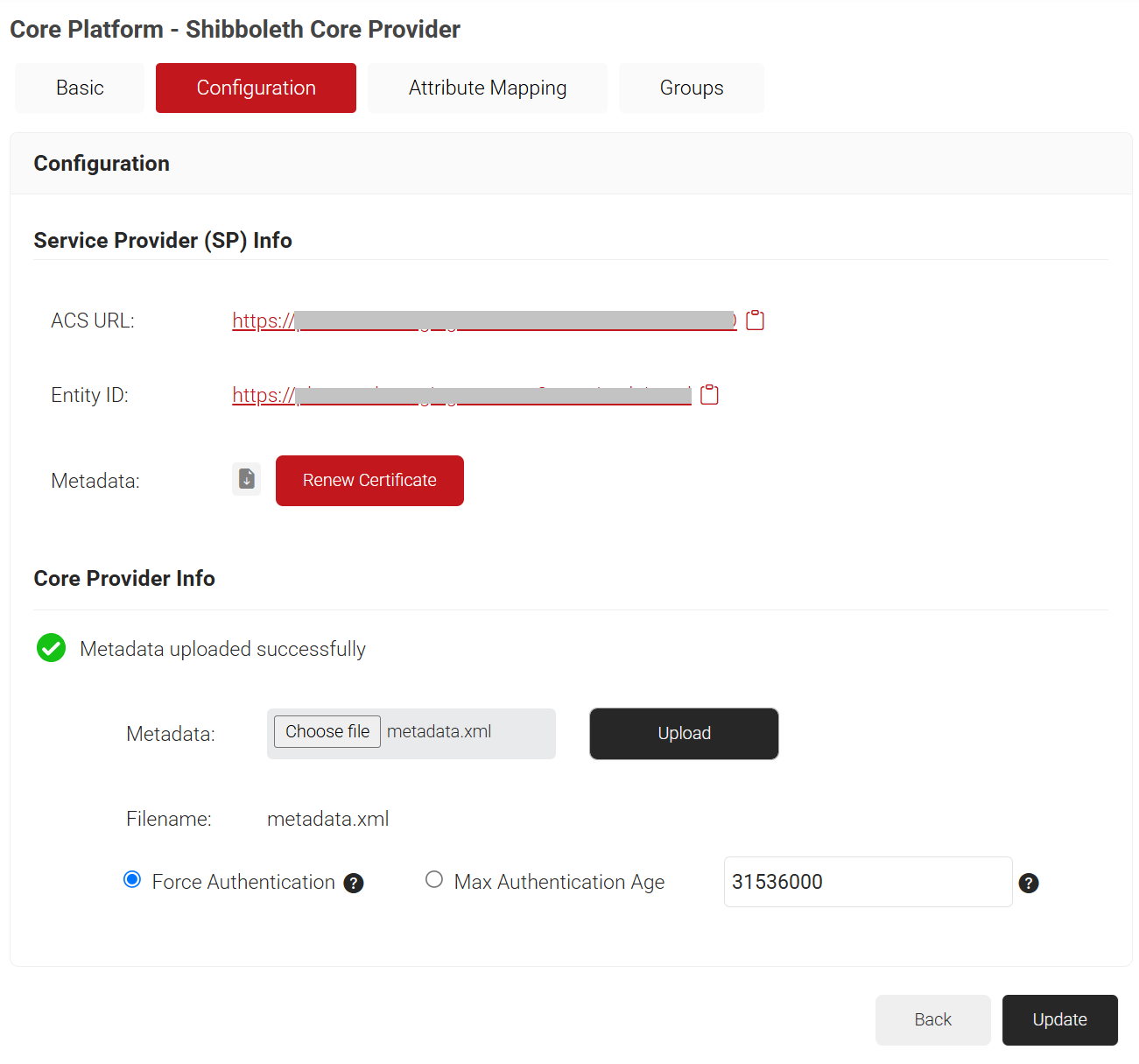 - In the Core Provider Info section, for the Metadata field, click Choose file and select the metadata (.xml) file that you downloaded earlier from Shibboleth.