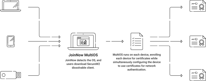 Shibboleth can work for Single Sign-On using the SAML protocol, which JoinNow MultiOS rapidly configures. JoinNow MultiOS plays a vital role in enabling self-service certificate-based authentication (EAP-TLS) for any user, allowing organizations to support passwordless security through our Public Key Infrastructure (PKI) by providing digital certificates efficiently. The method can be provided after validating the identity of the users within the IDP.