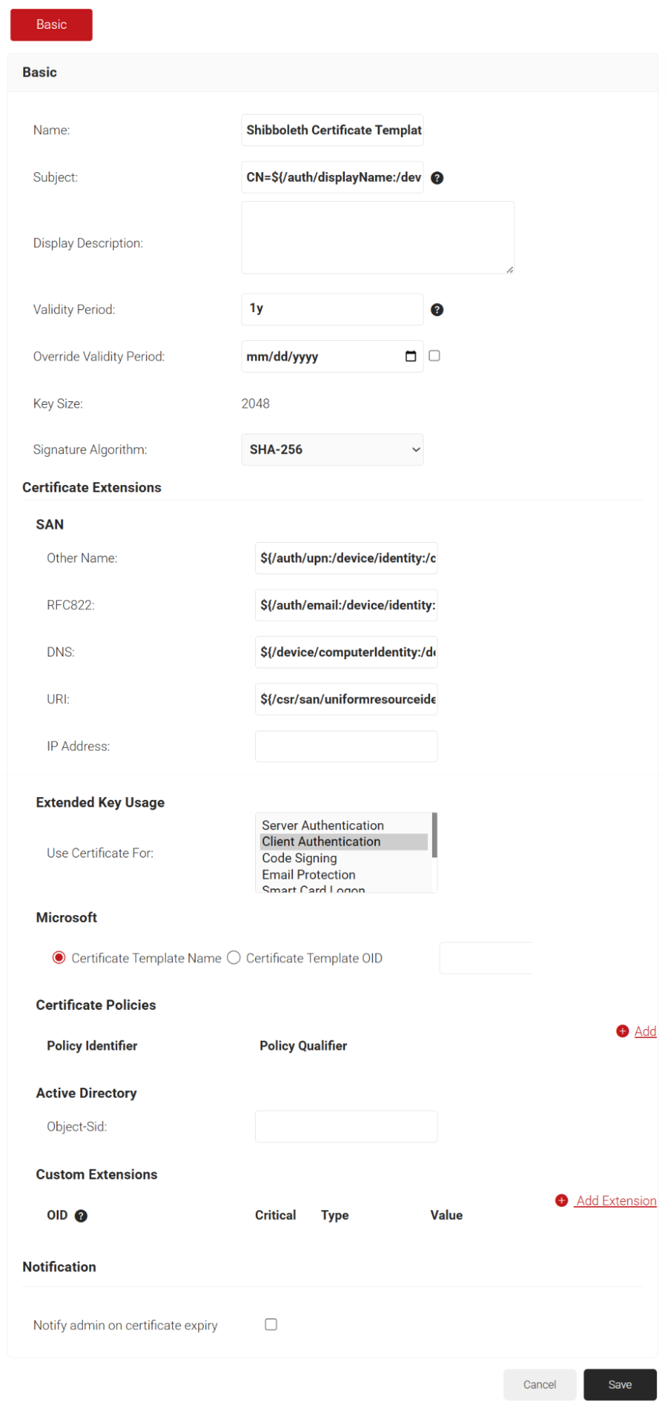 - n the Subject field, enter CN=${/auth/displayName:/device/identity}.