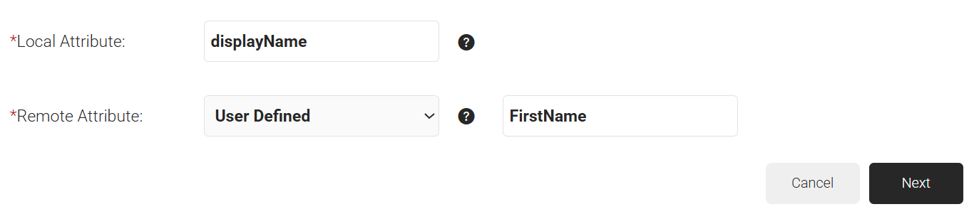 - From the Remote Attribute drop-down list, select User Defined. In the field that appears, enter ‘FirstName’ and then click Next.