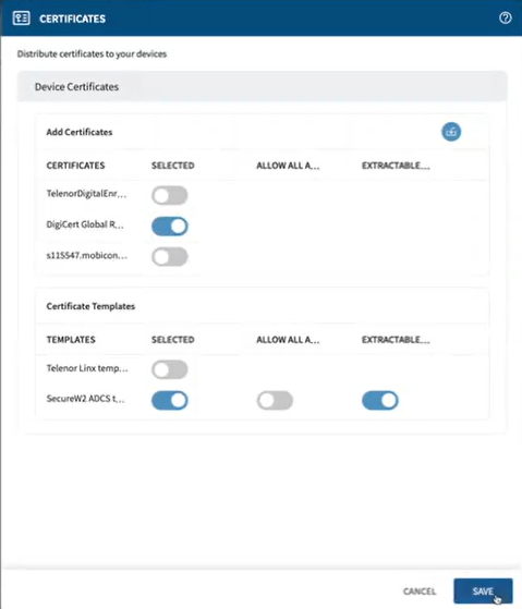 NOTE: Once you enable the certificate template, it’s corresponding certificate authority will be used. - Click SAVE.