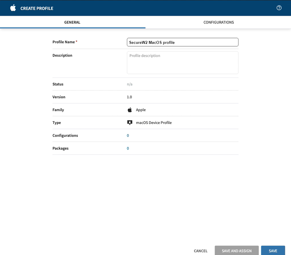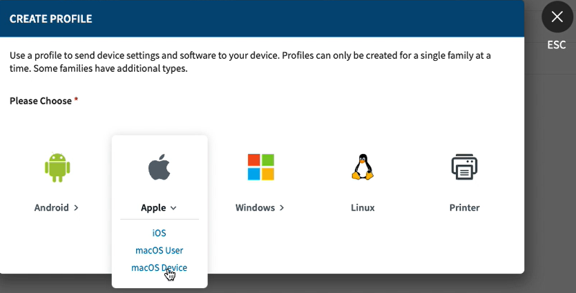 - In the CREATE PROFILE dialog box, select macOS Device.