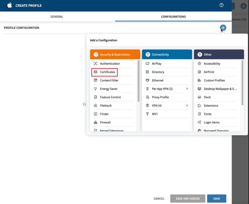 - In the Add a Configuration pop-up, select the Certificates option under the Security & Restrictions section.