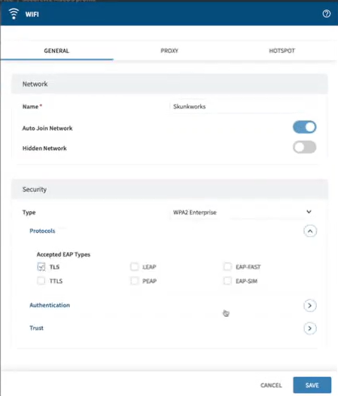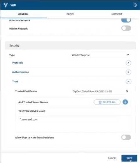 - In the TRUSTED SERVER NAME field, enter *.securew2.com (if you are using RADIUS server).