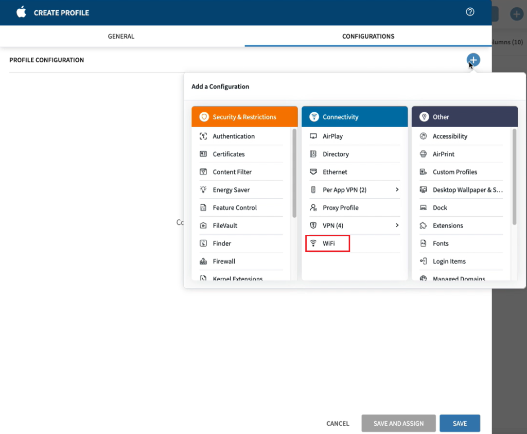 - In the Add a Configuration dialog box, select WiFi under the Connectivity section.
