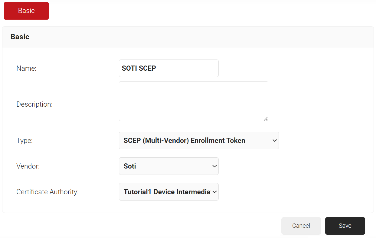 - From the Type drop-down list, select SCEP (Multi-Vendor) Enrollment Token.