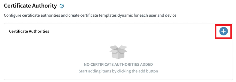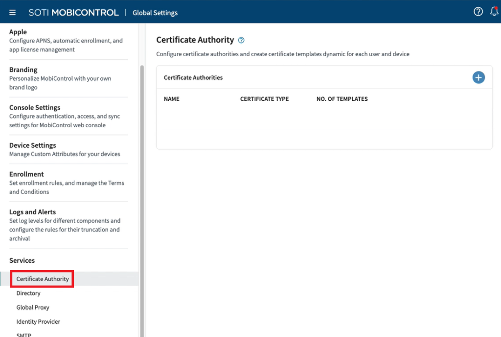 - To create a Soti Mobicontrol certificate template, scroll down to the Certificate Templates section and click the + button.