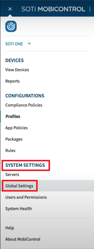 - From your SOTI Mobicontrol portal, click the Menu icon on the top left corner.