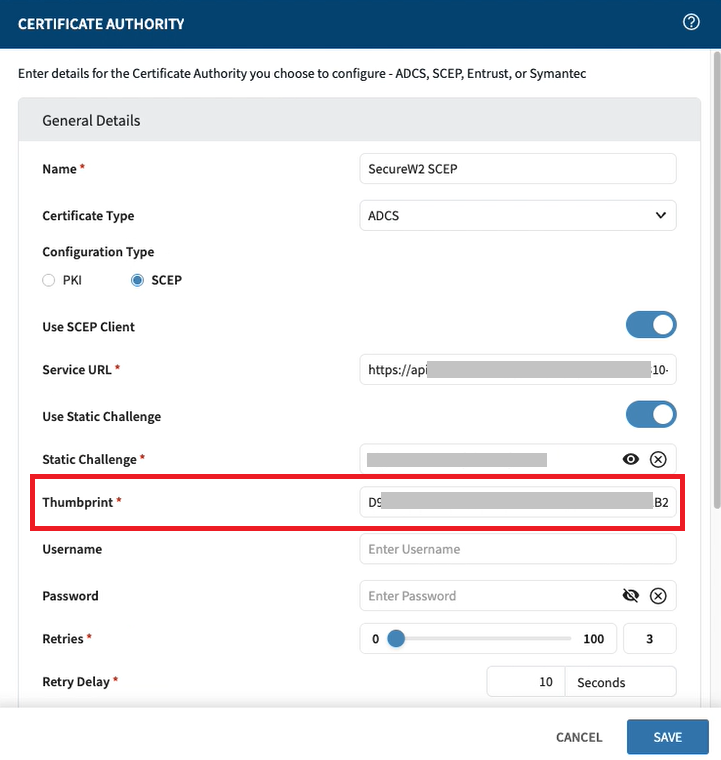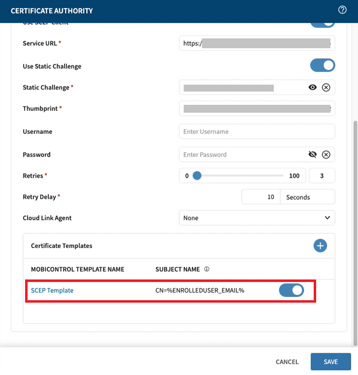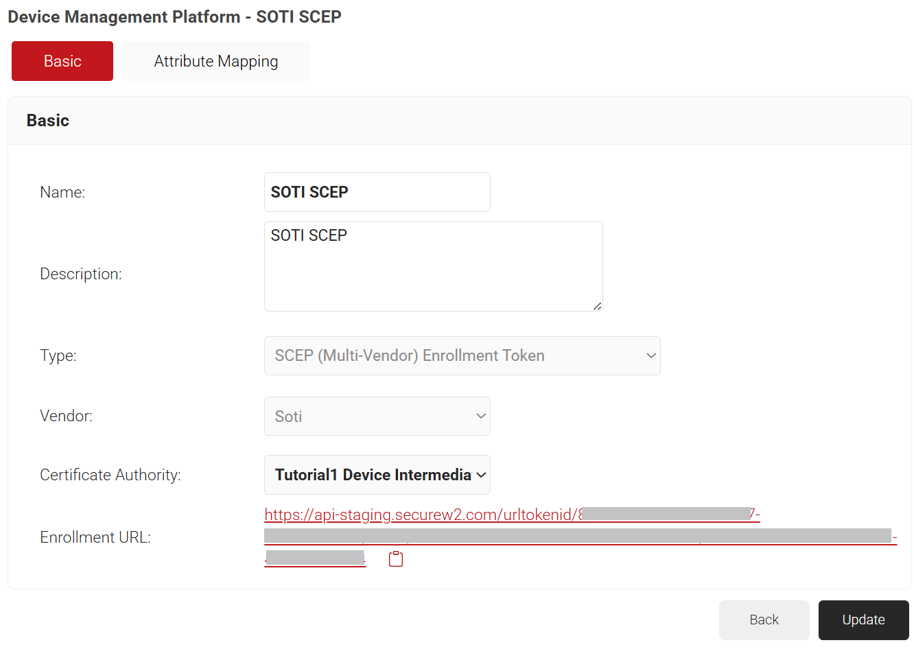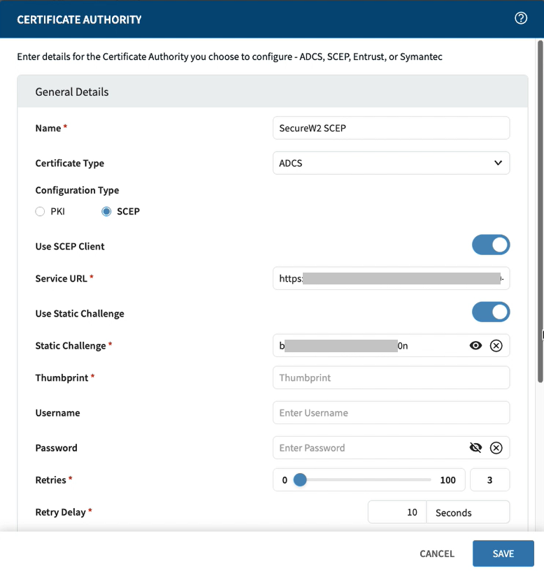 - In the Service URL field, enter the SCEP URL obtained from the .csv file (see the Create a Device Management Platform section).