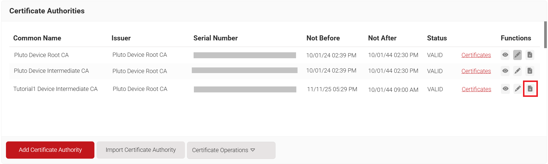 - Click the Download link for the Intermediate CA you created in the Create an Intermediate CA for SCEP Gateway Integration section.