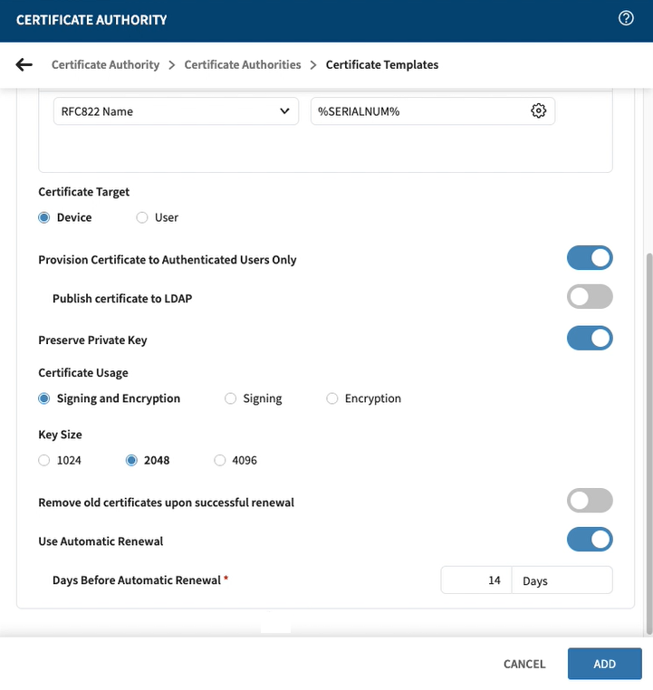 - Click ADD. The certificate template is created and enabled in the Certificate Templates section.