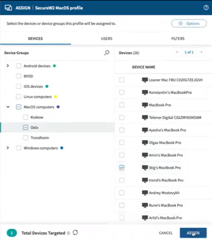 - In the ASSIGN dialog box, select a Device Group and choose your configured device under the Devices section.