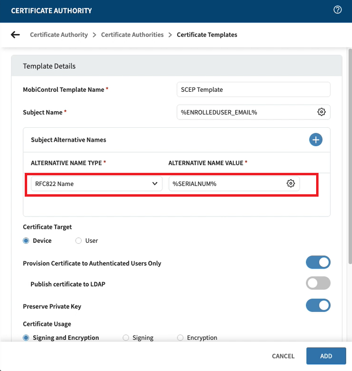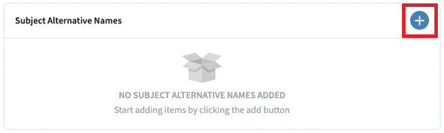 NOTE: Once the Subject Name is selected, enter “CN=” before the attribute. For example, select %ENROLLEDUSER_EMAIL% from the Subject Name drop-down list and add “CN=%ENROLLEDUSER_EMAIL%”. - Click the + button in the Subject Alternative Names section.