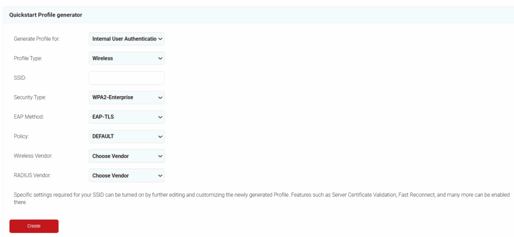 - On the Quickstart Network Profile generator page, from the Profile Type drop-down list, select Wireless.