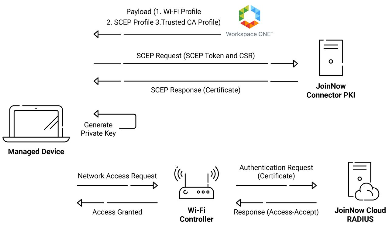 - When the devices onboard the Workspace ONE MDM, SCEP Profile, and Wi-Fi Profile are pushed to the managed devices. The SCEP profile initiates the Certificate enrollment process and installs the appropriate certificate.