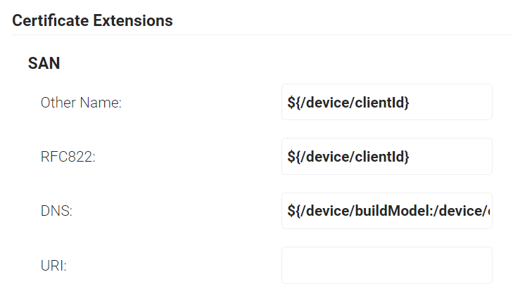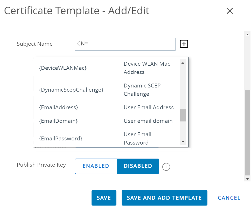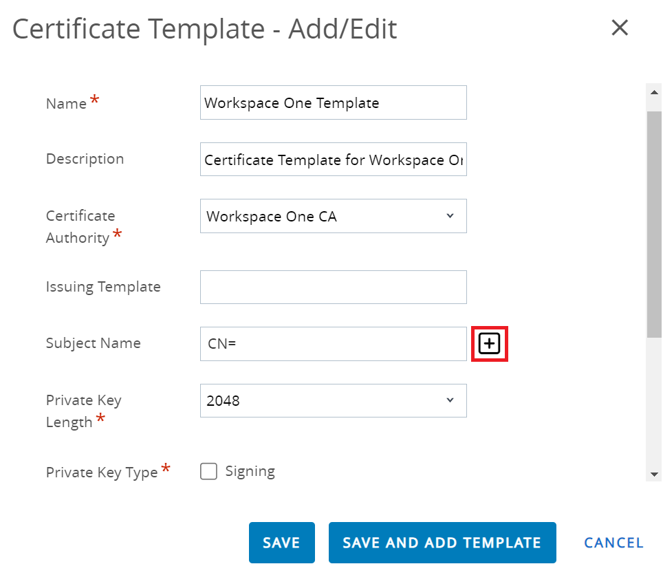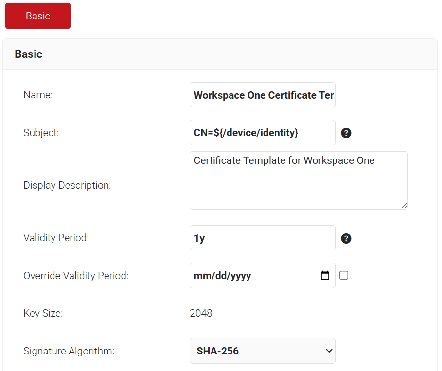 - In the Subject field, enter the following source value recommended for the Workspace ONE specific certificate template: CN=${/device/identity}.