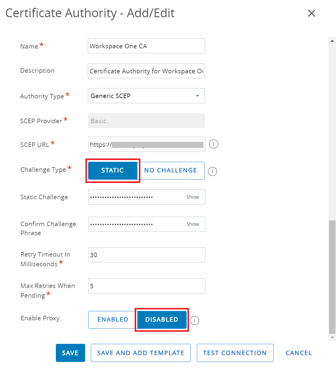 The SCEP URL serves as an endpoint that allows managed devices to connect with the SCEP server and enroll for certificates. The secret is also passed to Workspace One’s external CA to authenticate these certificate requests.