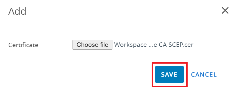 - On the Add pop-up window, click Choose file and upload the SecureW2 Issuing CA certificate you created earlier in the Creating an Intermediate CA for Workspace ONE SCEP Gateway Integration section.