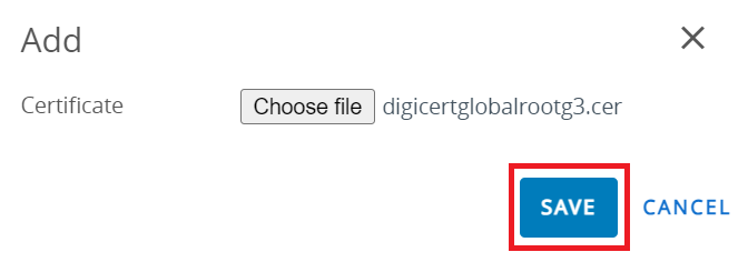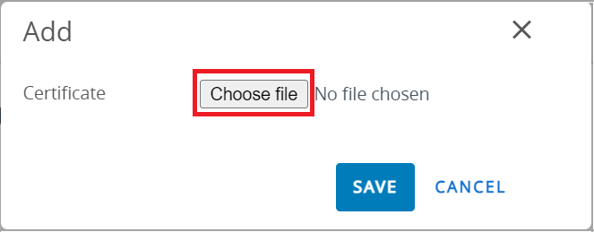 - In the Add pop-up window, click Choose file and select the Root CA certificate you want to upload.