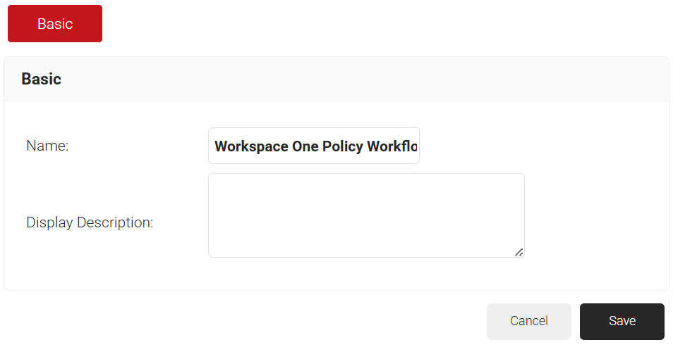 - In the Basic section, enter the name of the policy workflow in the Name field.