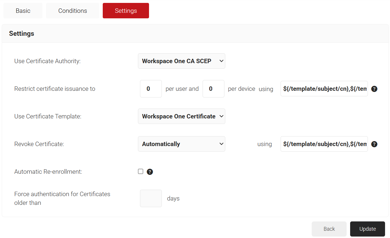 - In the Settings section, from the Use Certificate Authority drop-down list, select the intermediate CA you created earlier (refer to the Creating an Intermediate CA for Workspace One SCEP Gateway Integration section).