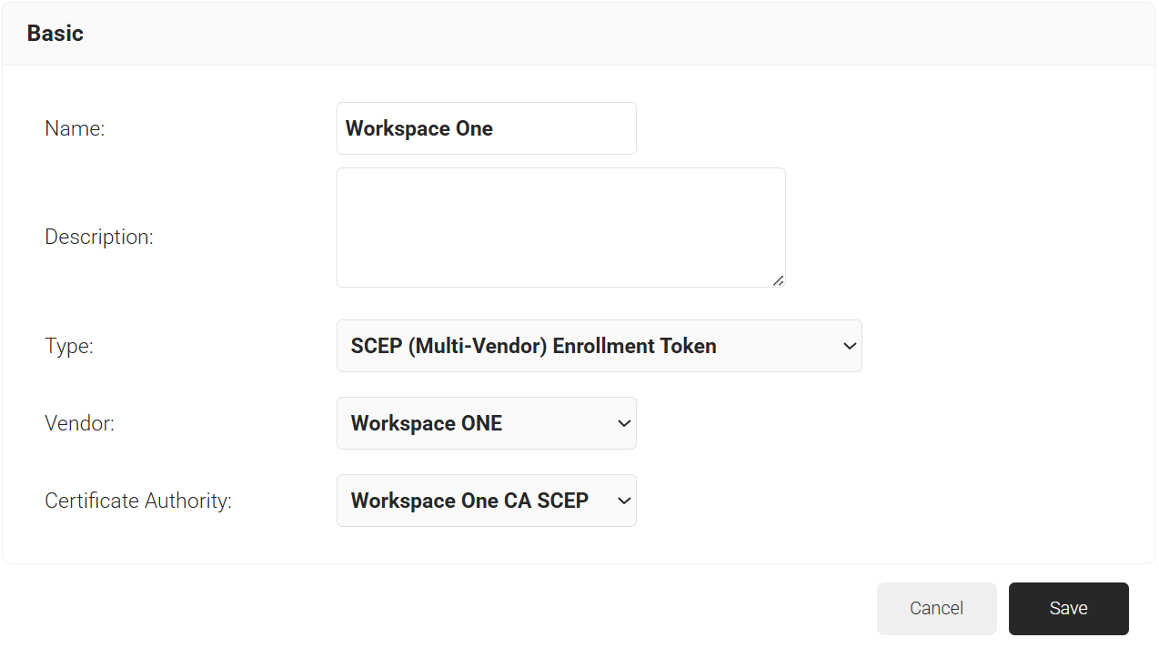 - From the Type drop-down list, select SCEP (Multi-Vendor) Enrollment Token.