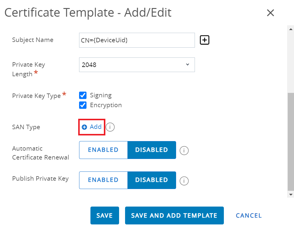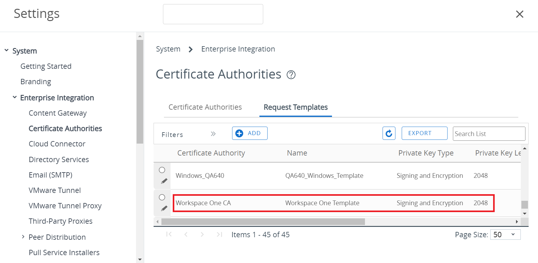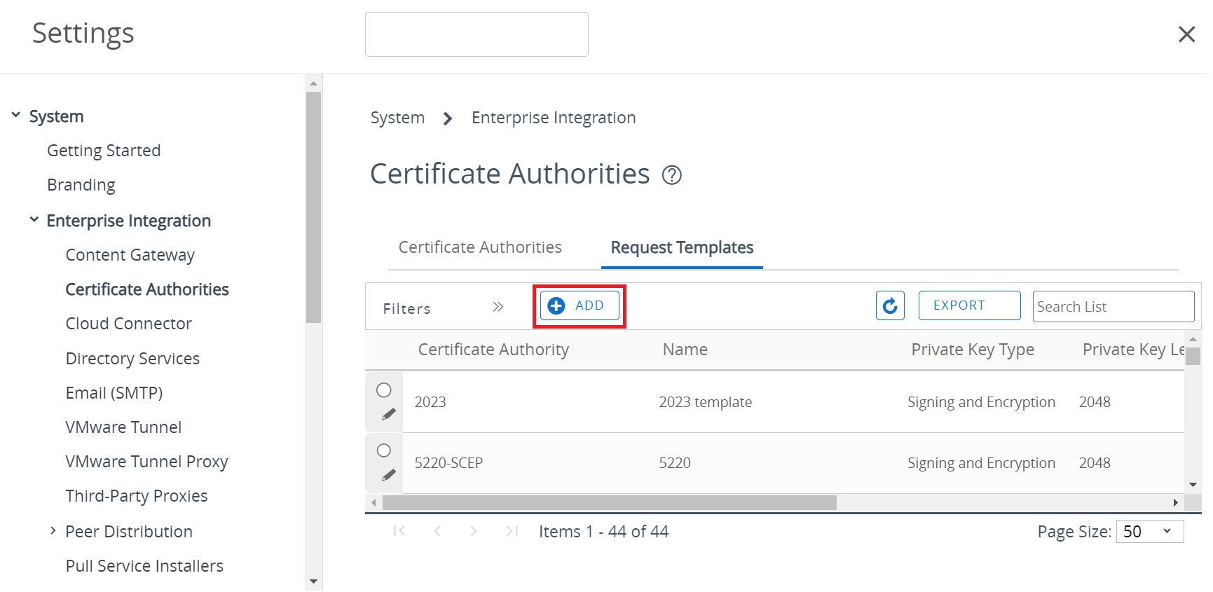 - Under the Request Templates tab, click + ADD to create a new Certificate Template.