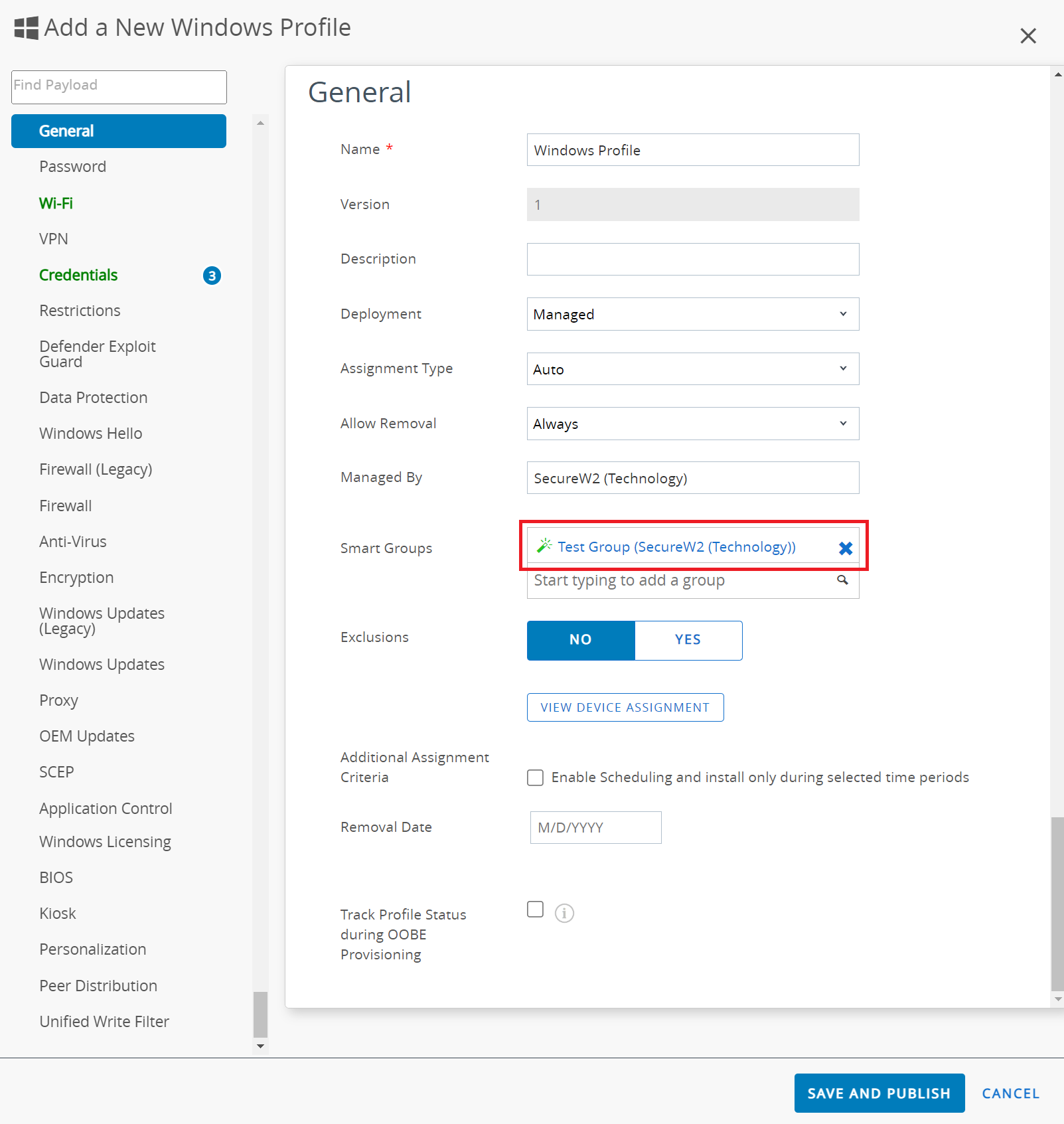 - Assign a group in the Smart Groups field to assign the profile to the device.