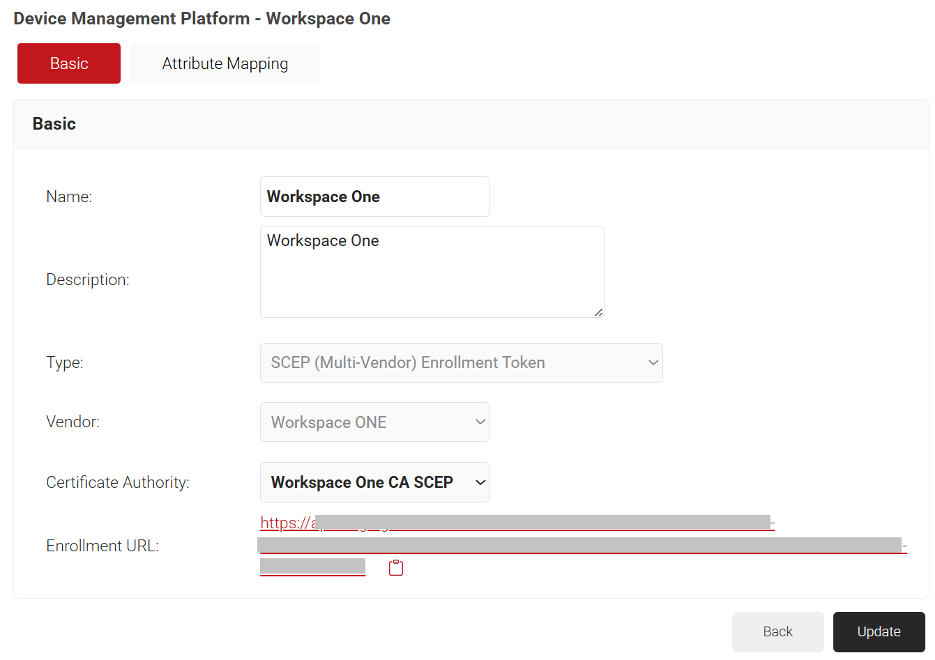 - In the SCEP URL field, enter the SCEP server URL obtained from the downloaded .csv file (refer to the Creating a Device Management Platform section). This is the endpoint that Workspace ONE will use to submit API calls to the Certificate Authority.