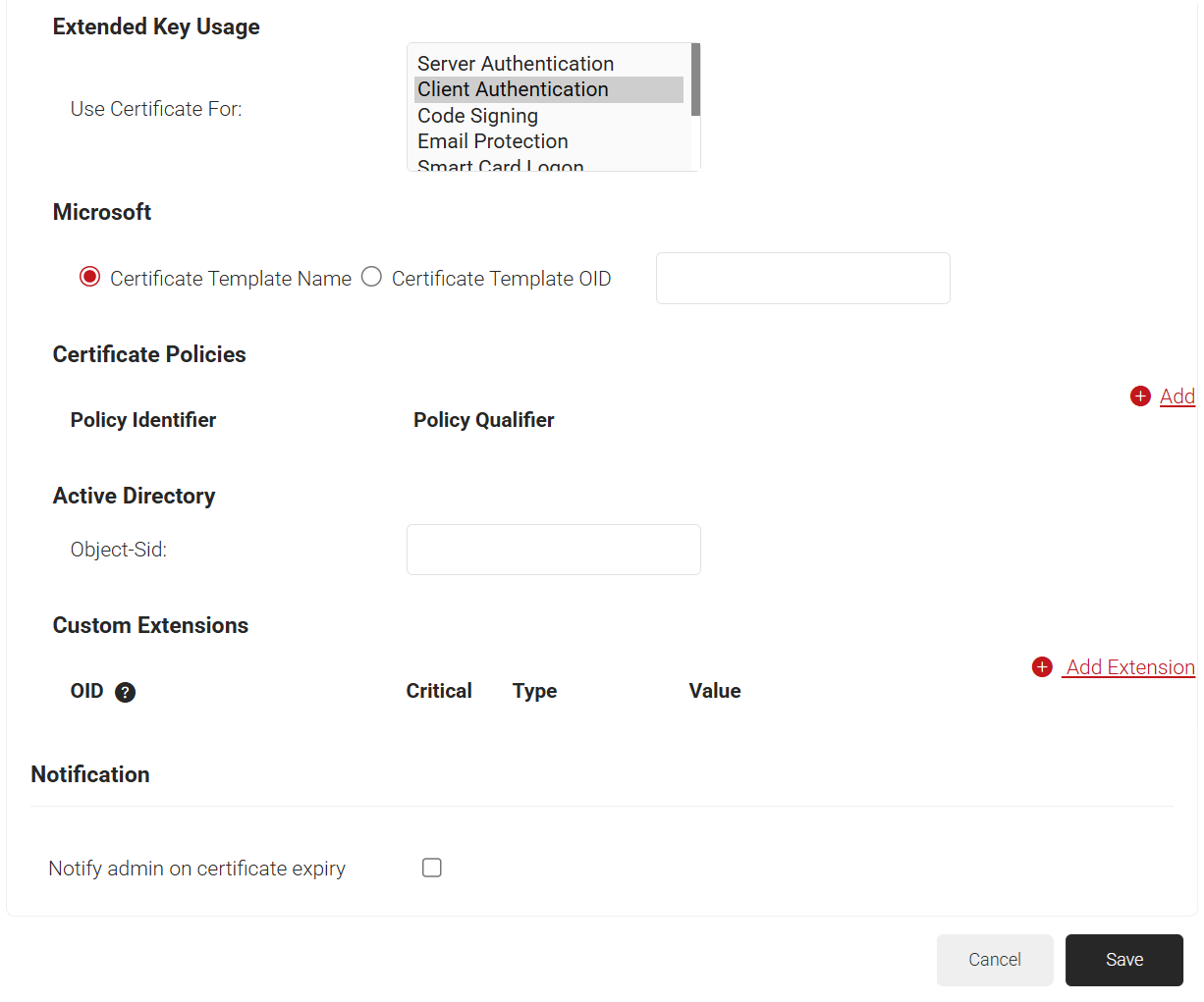 - In the Extended Key Usage section, from the Use Certificate For list, select Client Authentication.