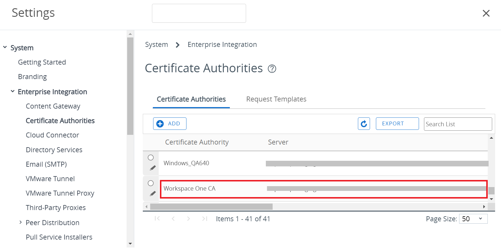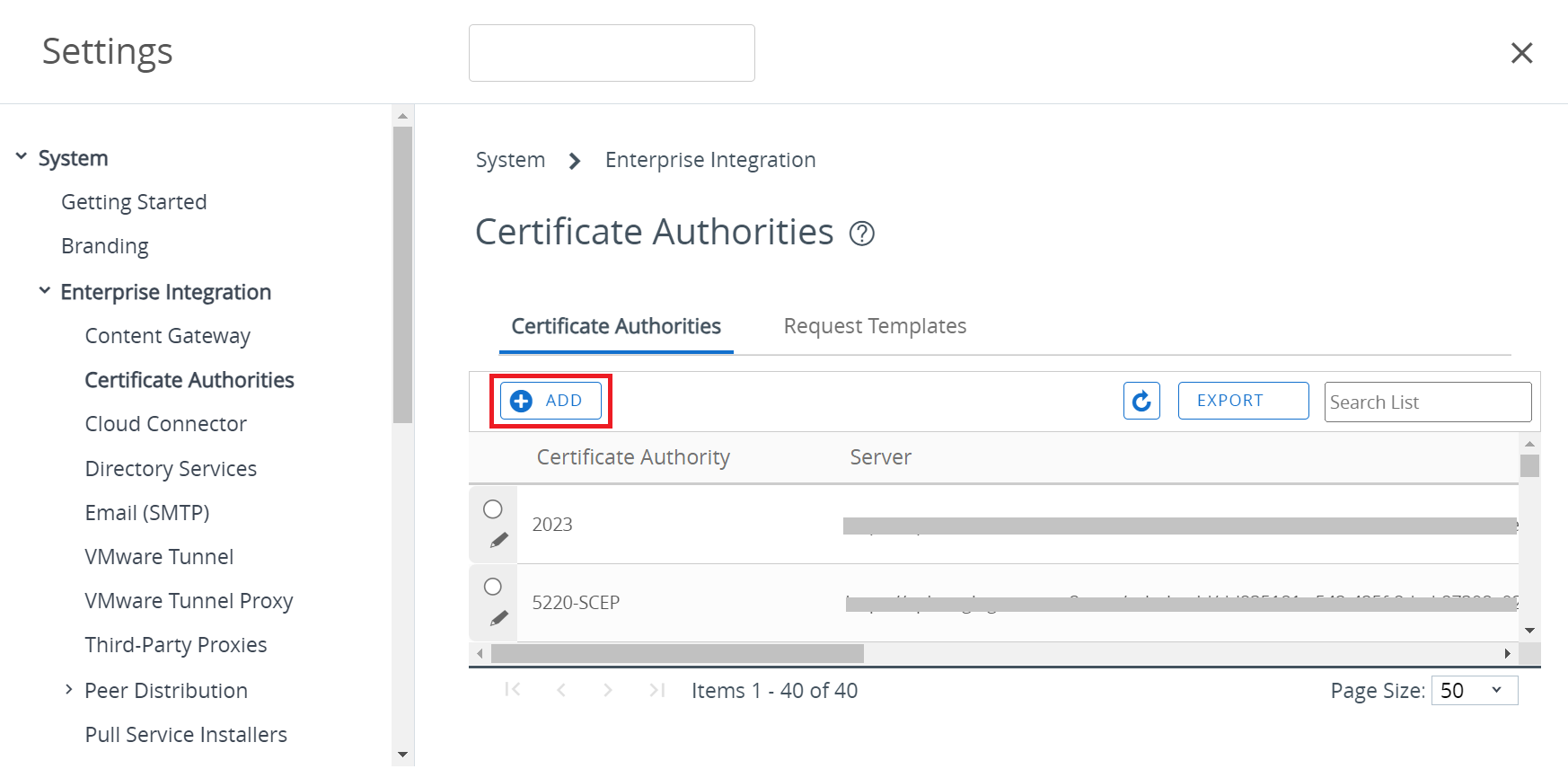 - Under the Certificate Authorities tab, click + ADD to create a new Certificate Authority.