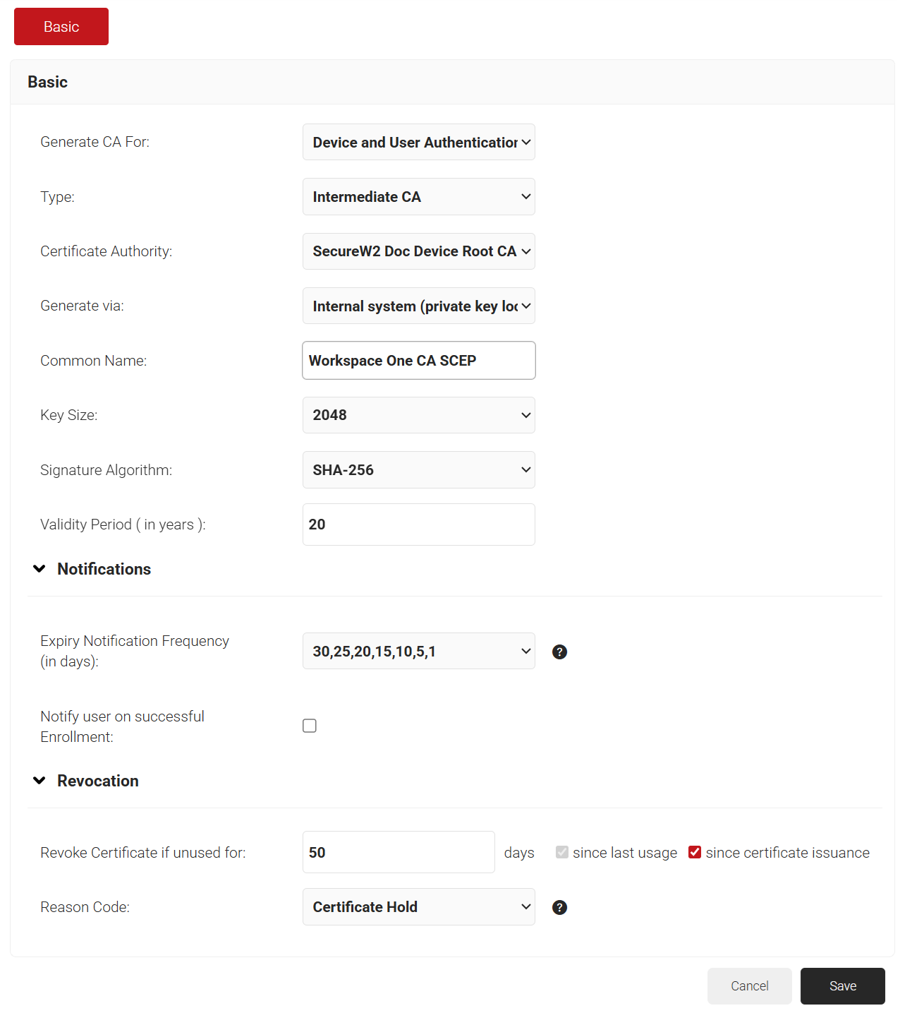 - In the Basic section, from the Generate CA For drop-down list, select Device and User Authentication to authenticate devices and users.