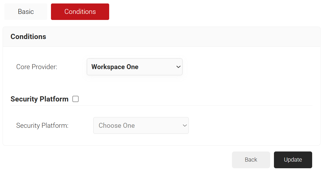 - In the Conditions section, from the Core Provider drop-down list, select the Device Management Platform that you created earlier (refer to the Creating a Device Management Platform section).
