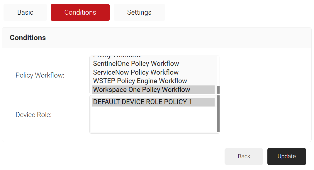 - In the Conditions section, from the Role list, select the Policy Workflow you created earlier (see the Configuring a Policy Workflow section).