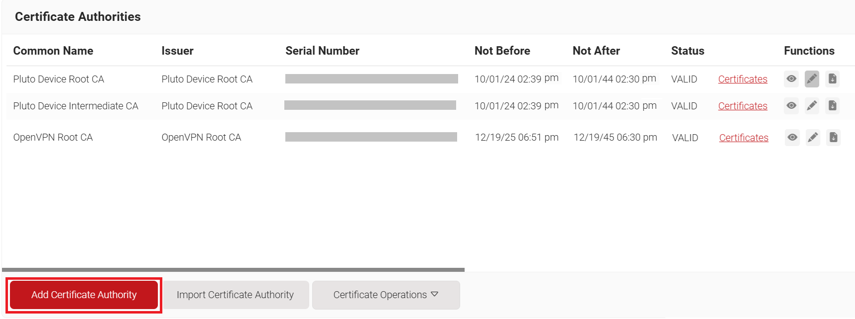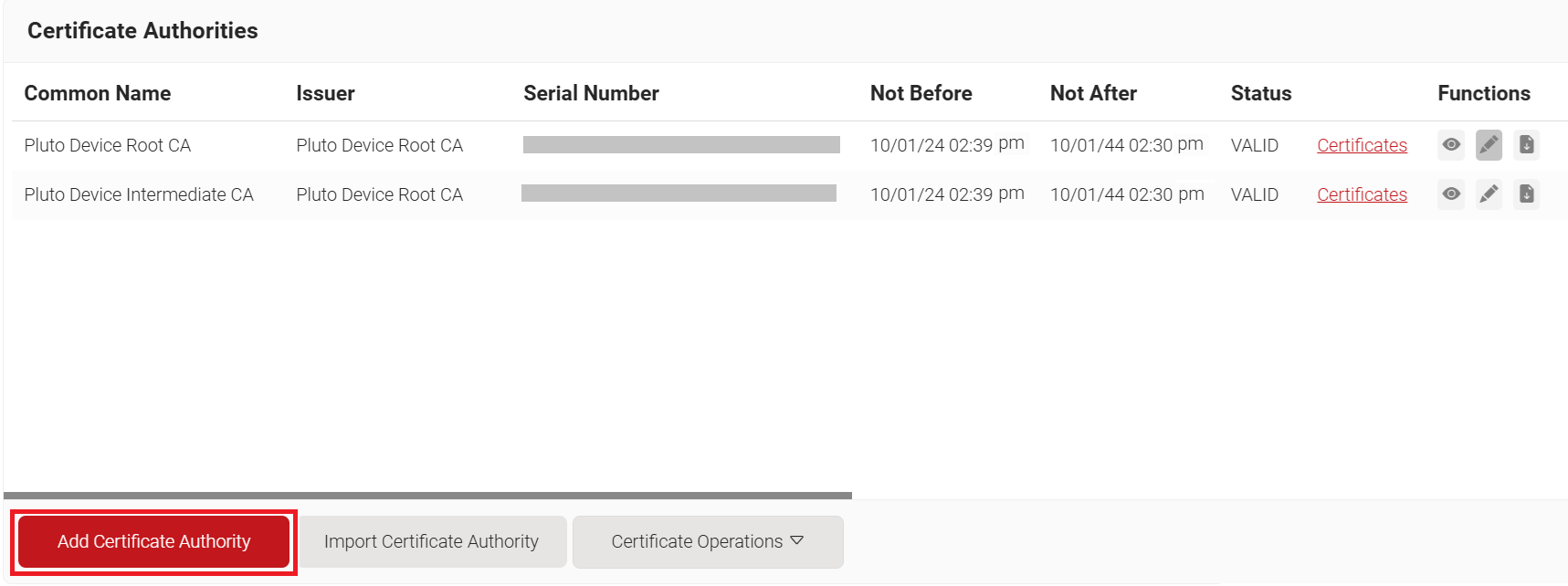 - Select the Intermediate CA created in Step 3, and then select the View icon under Functions.