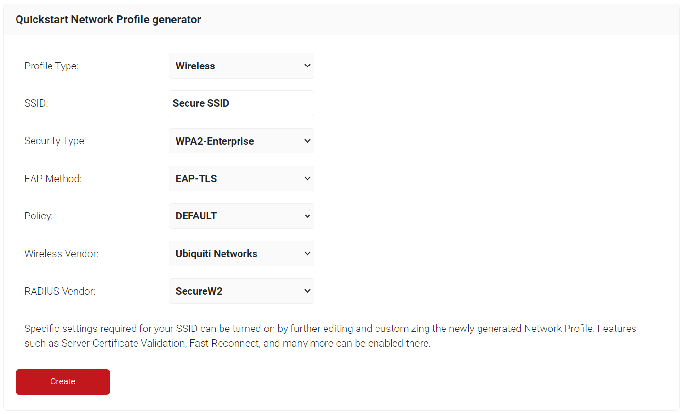 - On the Quickstart Network Profile generator page, from the Profile Type drop-down list, select Wireless.