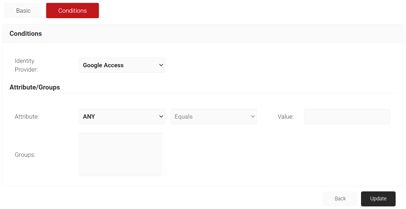- Under the Conditions section, from the Identity Provider drop-down list, select the IdP you created earlier (refer to the Create a Google Verified Access IdP section).