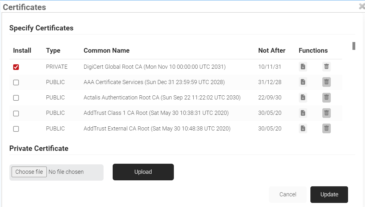 - In the Certificates pop-up window, select the checkbox next to DigiCert Global Root CA (Mon Nov 10 00:00:00 UTC 2031).